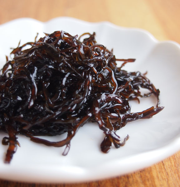 北海道根室産の細切り昆布を、甘味をきかせて艶やかで